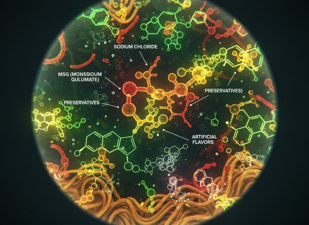 প্রস্তাবিত ছবি: একটি মাইক্রোস্কোপের নিচে নুডুলসের একটি ছবি (রূপক অর্থে), যা এর ভেতরের রাসায়নিক উপাদান দেখাচ্ছে।