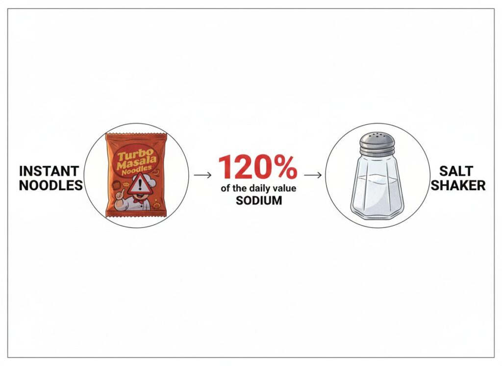 - বৈজ্ঞানিক ব্যাখ্যা: একটি সাধারণ ইন্সট্যান্ট নুডুলসের প্যাকেটে ১২০০ থেকে ১৮০০ মিলিগ্রাম পর্যন্ত সোডিয়াম (লবণ) থাকতে পারে। বিশ্ব স্বাস্থ্য সংস্থা (WHO) অনুযায়ী, ৪-৬ বছর বয়সী একটি শিশুর সারাদিনের সোডিয়াম চাহিদা ১৫০০ মিলিগ্রামের বেশি হওয়া উচিত নয়।